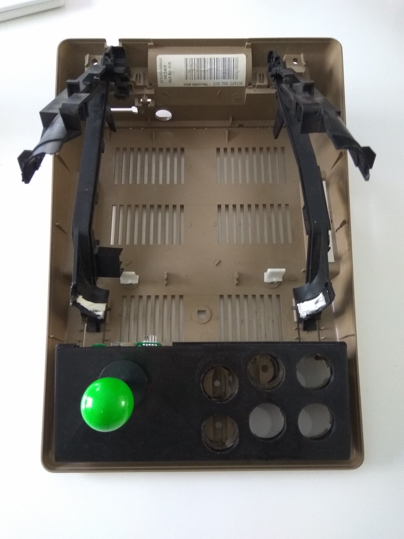 Pour résumer grossièrement son travail, Jérôme a transformé un minitel en Tabletop/mini Bartop en remplaçant l’écran cathodique par un LCD 4/3, implantant un Raspberry Pi 3 avec une RecalBox, un stick arcade et des boutons. Il lui a donné un très beau look Astro City, borne emblématique de chez SEGA.