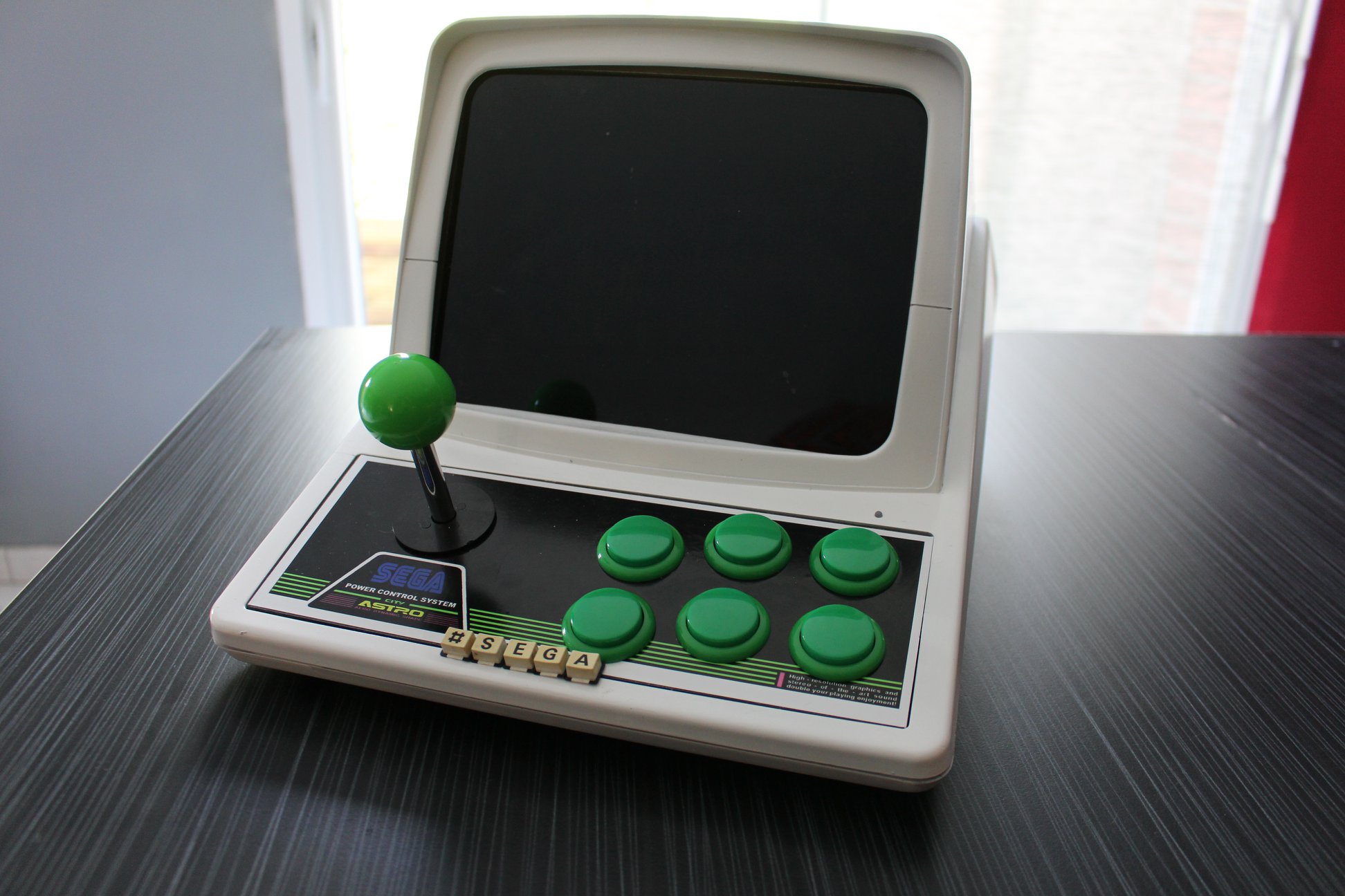 Pour résumer grossièrement son travail, Jérôme a transformé un minitel en Tabletop/mini Bartop en remplaçant l’écran cathodique par un LCD 4/3, implantant un Raspberry Pi 3 avec une RecalBox, un stick arcade et des boutons. Il lui a donné un très beau look Astro City, borne emblématique de chez SEGA.